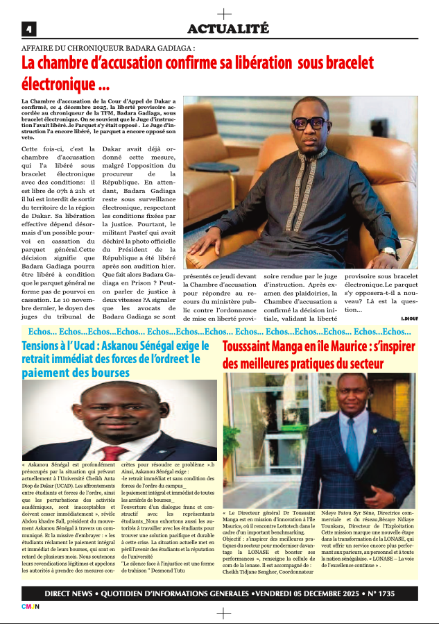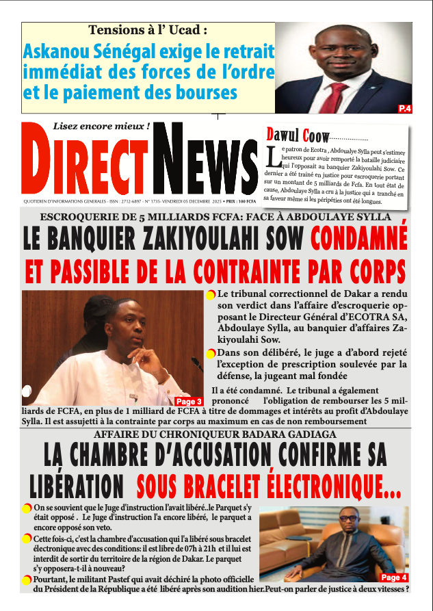 Askanou Sénégal est profondément préoccupés par la situation qui prévaut actuellement à l’Université Cheikh Anta Diop de Dakar (UCAD). Les affrontements entre étudiants et forces de l’ordre, ainsi que les perturbations des activités académiques, sont inacceptables et doivent cesser immédiatement », révèle Abdou khadre Sall, président du mouvement Askanou Sénégal à travers un communiqué. Et la missive d’embrayer : « les étudiants réclament le paiement intégral et immédiat de leurs bourses, qui sont en retard de plusieurs mois. Nous soutenons leurs revendications légitimes et appelons les autorités à prendre des mesures concrètes pour résoudre ce problème ».Ainsi, Askanou Sénégal exige : le retrait immédiat et sans condition des forces de l’ordre du campus, le paiement intégral et immédiat de toutes les arriérés de bourses, l’ouverture d’un dialogue franc et constructif avec les représentants étudiants.