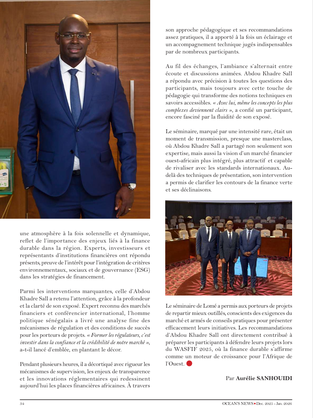 Parmi les interventions marquantes, celle d’Abdou Khadre Sall a retenu l’attention, grâce à la profondeur et la clarté de son exposé. Expert reconnu des marchés financiers et conférencier international, l’homme politique sénégalais a livré une analyse fine des mécanismes de régulation et des conditions de succès pour les porteurs de projets. « Former les régulateurs, c’est investir dans la confiance et la crédibilité de notre marché »,a-t-il lancé d’emblée, en plantant le décor.